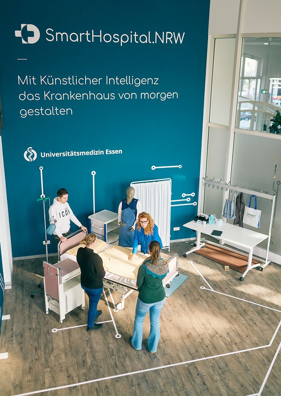 Aber die Zulassung als Medizinprodukt ist eine Minimalvoraussetzung, um ein Produkt in den Umlauf zu bringen. Und dann muss genauso wie bei anderen technischen Neuerungen das Personal entsprechend eingeführt und geschult werden. Wir untersuchen zum Beispiel im Rahmen von Transformationsmodellen, ob eine eigene Qualifizierung für das Personal notwendig ist. In Krankenhäusern gibt es ja Mitarbeitende, die Jahrzehnte dort bleiben. Für jüngere Kolleg*innen, egal in welchem Beruf, ist die Schwelle niedriger, sich weiterzubilden, vielleicht sogar berufsbegleitend ein Bachelorstudium „Pflege und Digitalisierung“ zu machen, wie die FOM es in Kooperation mit der UME anbietet. Der Fokus muss aber auch auf den älteren Mitarbeitenden liegen. Für diese Gruppe ist es wichtig, dass man Module anbietet, einzelne Fächer, die man belegen kann, ohne den Druck eines kompletten Studiums. Es muss eher niedrigschwellig sein, und dann versuchen wir immer wieder, die Leute da heranzuführen. Das ist, glaube ich, auch vor dem Hintergrund sehr wichtig, dass die Welt sich ändert und Digitalisierung überall Einzug hält –ob ich ein Bahnticket buche oder es künftig das 49-Euro-Ticket nur als digitales Ticket geben soll.